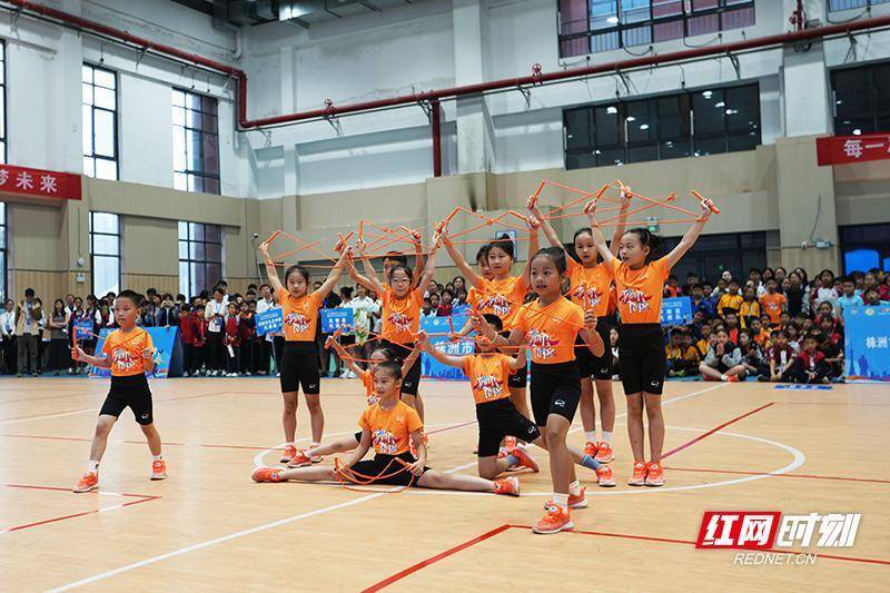 小选手在赛场上表演跳绳花样动作,他们动作整齐、姿态优美,手中的跳绳交织出灵动的图案。