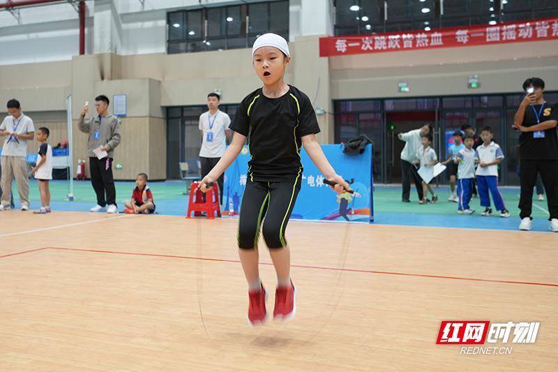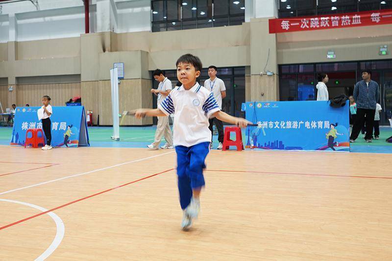小选手在赛场上奋力跳绳,在“每一次跳跃皆热血”的标语映衬下,展现出拼搏的运动精神。